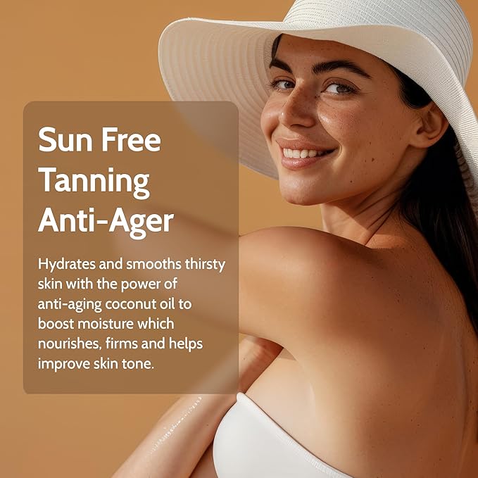 - SUN FREE TANNING ANTI-AGER - Achieve perfectly tanned skin with benefits; hydrates and smooths thirsty skin with the power of anti-aging coconut oil to boost moisture which nourishes, firms and helps improve skin tone.