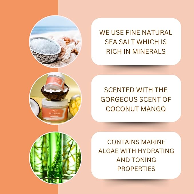 Sea Salt Body Scrub by Florida Suncare - Ocean Salt Body Polish Infused with Marine Algae - Exfoliating Face and Body Scrub - Facial Scrub Exfoliator to Tackle Acne and Scars (Coconut Mango, 3.3 oz)