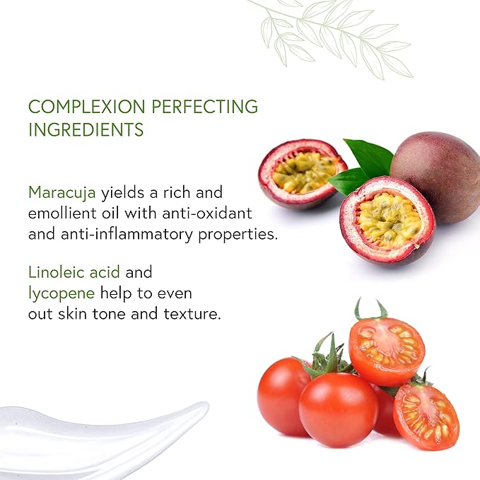 - Maracuja Oil & Antioxidants: Infused with linoleic acid and lycopene to help even skin tone & texture; Ideal for all skin types
