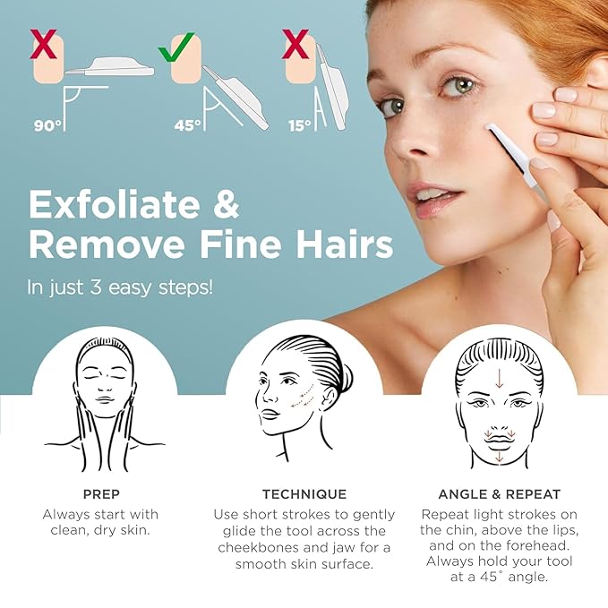 - Easy 3-Step Use at Home - Step 1: Clean and dry skin completely. Step 2: Hold blade at a 45Β° angle for optimal results. Step 3: Glide downward gently while keeping skin taut; ideal for dermaplaning, eyebrow shaping, and precise grooming.