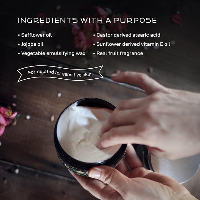 - KEY INGREDIENTS - Water, organic safflower seed oil, non-GMO emulsifying wax (vegetable), organic jojoba oil, organic fragrance (natural fruit, vegetables, flowers), stearic acid (castor), organic propanediol (corn), organic pentylene glycol (sugar cane /corn cobs), organic phenethyl alcohol (corn), non-GMO vitamin E oil (sunflower)