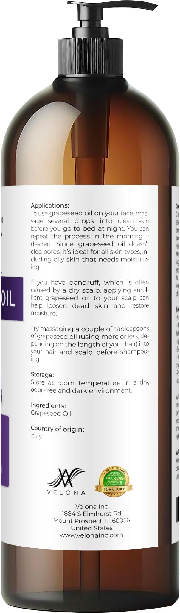 Grapeseed Oil by Velona - 32 fl oz | 100% Pure and Natural Carrier Oil | Refined, Cold Pressed | Cooking, Skin, Face, Body, Hair Care | Use Today - Enjoy Results