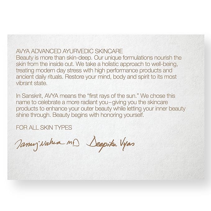 - ADVANCED SCIENCE + AYURVEDICS: AVYA Signature Qusome boosts radiance and texture with botanical blends containing peony, turmeric and neem.