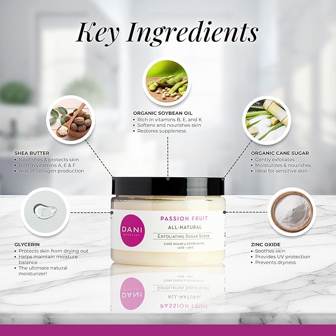 - ● Radiant Skin & Gentle Exfoliation – Organic cane sugar exfoliates to reveal smoother, softer skin. Perfect for face & body, leaving skin refreshed with Passion Fruit