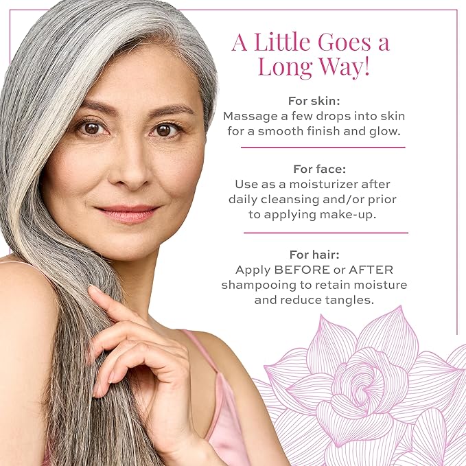 - A LITTLE GOES A LONG WAY!: Massage a few drops into skin for a smooth, glowing finish, use as a face moisturizer for a flawless makeup base, or apply to the scalp to retain moisture and reduce tangles, proving that a small amount delivers amazing benefits