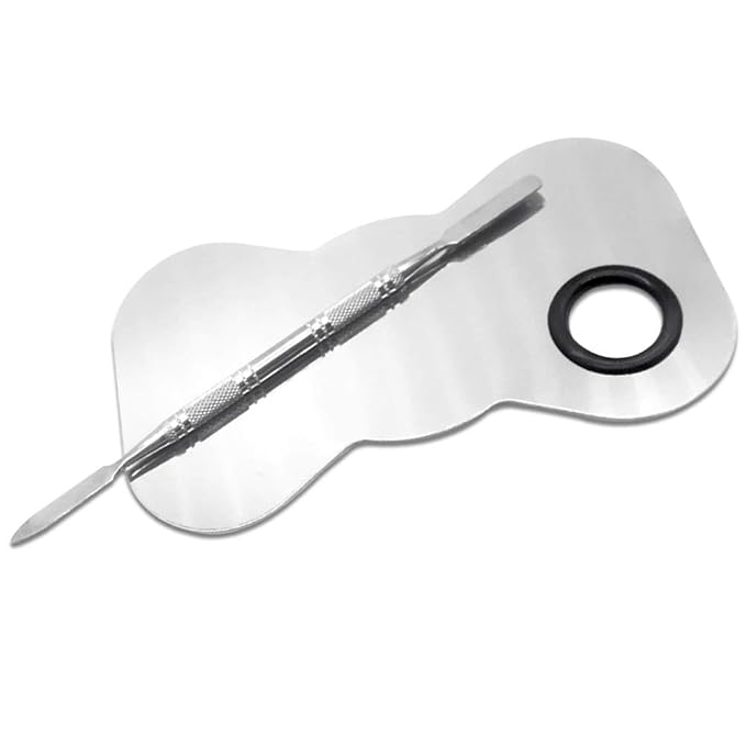 - Great Design:Palette with a diameter 2cm rubber-coated thumb hole for easy holding. Easy to fits your makeup bag, perfect size for traveling and taking along.Stainless steel silver design looks elegant and fashion.The surface is bright as a mirror with lines rounded smooth edges. Make-up color bar with fine rubbing non-slip. The color bar is a flat round head, easy to mix, not hurt your hands.