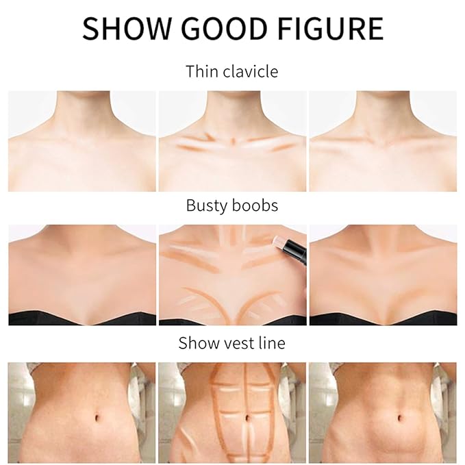 - đźăMultifunctionalăWith this Cream Contour Stick, you can not only Create a natural 3D makeup look, you can also applied it to your body to create or highlight abs or clavicle. Waterproof long-lasting effect.