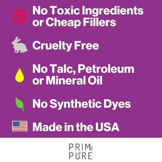 - BEAUTIFUL FUN COLORS: Prim and Pure makes clean beauty products that are SUPER SAFE and SUPER FUN! Other brands use synthetic dyes, colors, or hormone disrupting preservatives. Have you seen the news about dangerous ingredients like talc and asbestos in makeup made for kids?! We think you deserve better! Our products are Cruelty Free & made WITHOUT the use of: Bismuth, Gluten, Parabens, Talc, Corn Starch, Rice Powder, Mineral Oil, Kaolin Clay, Synthetic Dyes, Phthalates, Soy, & GMOs.