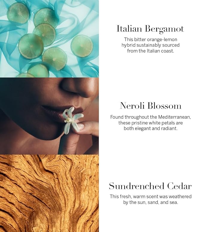 - Scent Notes: Italian bergamot, neroli blossom, and sundrenched cedar