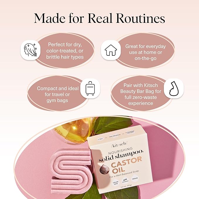 Kitsch Castor Oil Shampoo Bar Soap - Hydrating & Moisturizing Hair Care - Organic Castor Oil Solid Shampoo for Hair Growth & Scalp Nourishment - Silicone & Paraben-Free, Vegan, Made in USA - 3.2oz