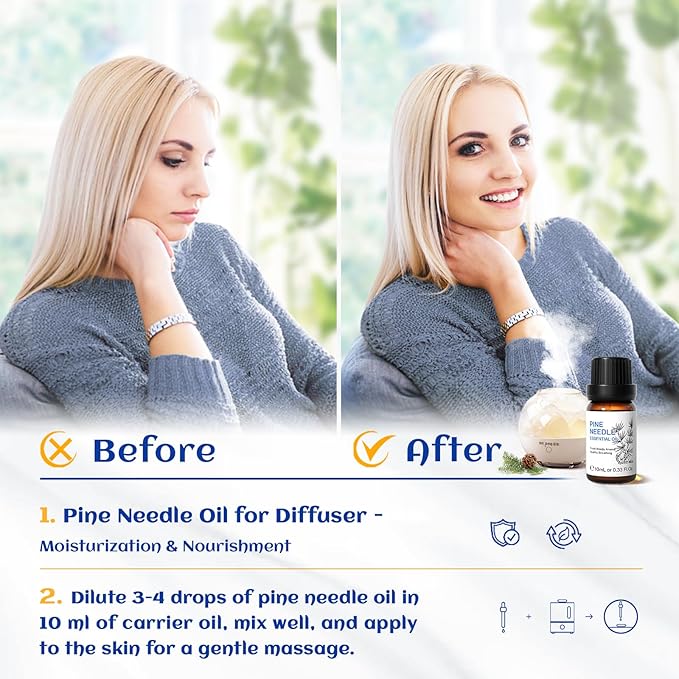 - Multi-Purpose: Pine needle essential oil has a multi-purpose natural remedy with a fresh woody and winter forest airy aroma that can help relax the mind, balancing emotions. Repairs skin imperfections and smoothes the skin
