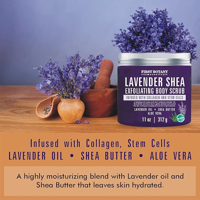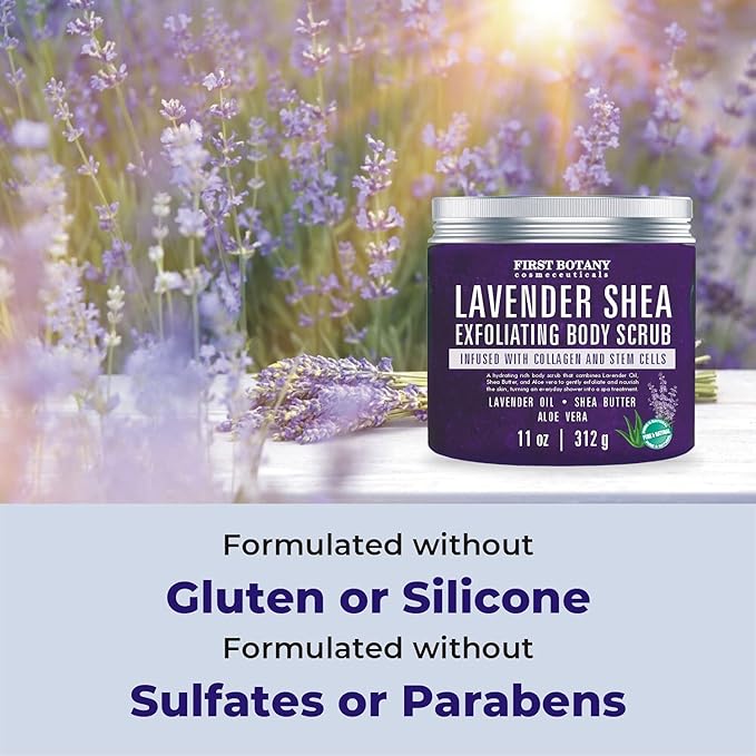 First Botany Body Scrub - Natural Exfoliating Salt Scrub & Body and Face Souffle helps with Moisturizing Skin, Acne, Cellulite, Dead Skin Scars, Wrinkles (10 fl oz, Lavender)