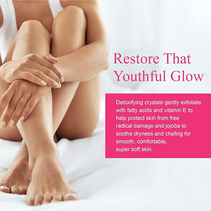 - RESTORE THAT YOUTHFUL GLOW - Detoxifying crystals gently exfoliate with fatty acids and vitamin E to help protect skin from free radical damage and jojoba to soothe dryness and chafing for smooth, comfortable, super soft skin.