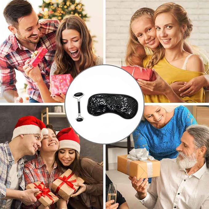 Eye Mask Set (2packs) - Hot and Code Eye Mask and Facial Roller Tools Set 100% Natural Jade Stone Beauty Massage Body Eyes Neck for Dark Circles and Puffiness-Color Black