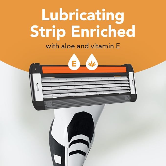 - COMFORTABLE SHAVE: Lubricating strip enriched with aloe and vitamin E enhances glide for a comfortable shave, ideal for sensitive skin.