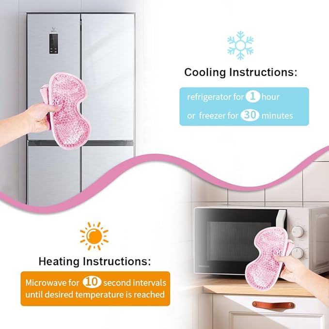 - ✿Hot Cold Therapy - For Cool Compress - Sealed the Gel eye mask in a storage bag and then place it in fridge for ice pack. Freeze it for 35 minutes or chill it for 1-2 hours. Cold eye mask can hold the therapeutic temperature for the doctor recommended time of approximately 20 minutes. For Warm Compress - Place it in microwave and heat it on Medium-high for 10 seconds at a time.