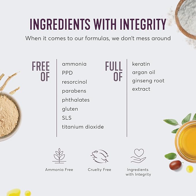 - KERATIN ENRICHED HAIR COLOR: Permanent hair color is infused with hair-loving ingredients: keratin, argan oil, and ginseng root extract to leave your hair feeling healthy, conditioned, and shiny. No harsh ingredients: 100% ammonia-free, PPD-free, resorcinol-free, paraben-free, pthalates-free, SLS-free, gluten-free, titanium-dioxide-free, and cruelty-free.