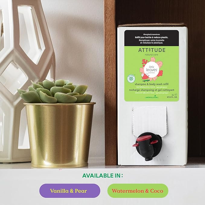 ATTITUDE Shampoo and Body Wash for Kids, EWG Verified Hair and Body Cleanser, Dermatologically Tested Soap, Plant and Mineral Based Bath Products, Vegan, Bulk Refill, Watermelon and Coco, 67.6 Fl Oz