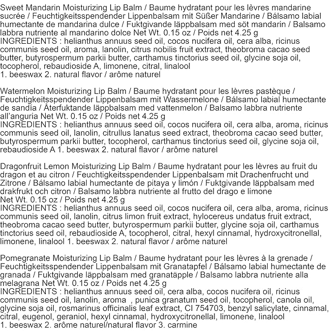 - ADORED HOLIDAY FLAVOR: Start up the holiday spirit by enjoying the classic flavoring of the holidays with lip balm that taste like Sweet Mandarin, Watermelon, Dragonfruit Lemon and Pomegranate flavors