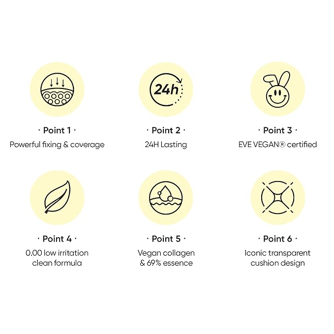 - Clean & vegan cushion Its formula & package is free of any animal products or by-products and is certified by EVE VEGAN.