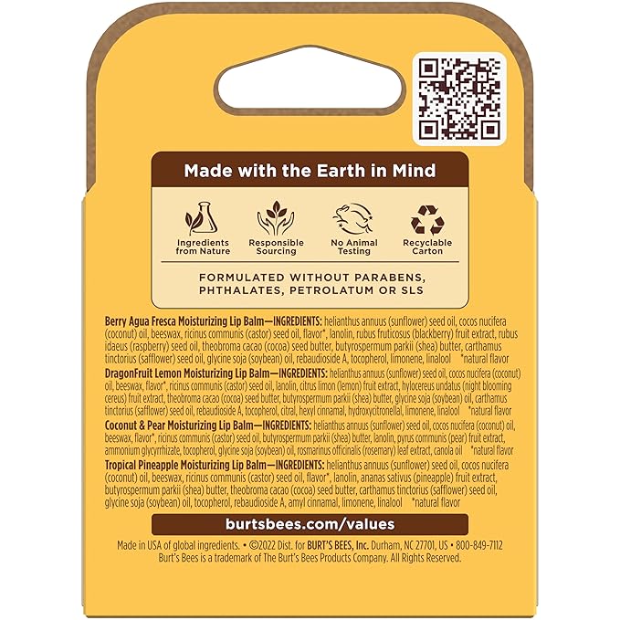 - FLAVORFUL LIP BALM: One package contains four 0.15 oz. lip balm tubes of Burt’s Bees Lip Balm in Berry Agua Fresca, Dragonfruit Lemon, Coconut and Pear, and Tropical Pineapple flavors
