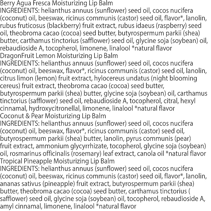 - FOUR REFRESHING FLAVORS: Delight the senses with Berry Agua Fresca, Dragonfruit Lemon, Coconut and Pear, and Tropical Pineapple flavors that will encourage you to apply this flavored lip balm often