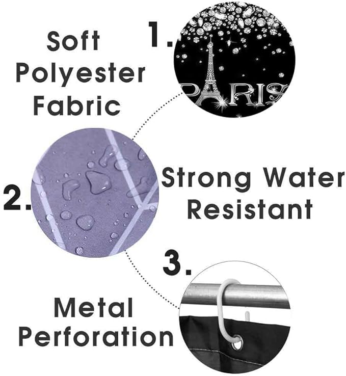 4PCS Eiffel Tower Shower Curtain Set, Luxury Jewelry Rhinestone Bling Diamond Paris Bathroom Decor, Waterproof Fabric Black Shower Curtain, Non-slip Bath Mat Toilet Lid Cover Bathroom Rugs