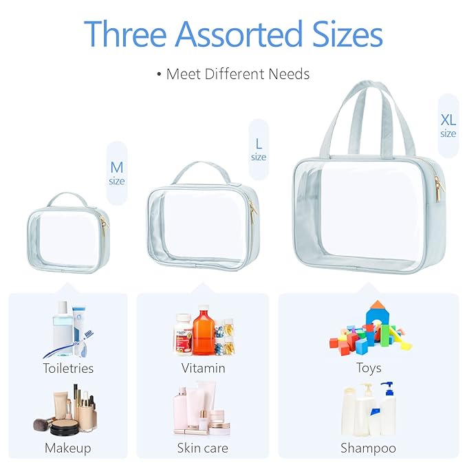 - Portable & Reusable: 3 packages can meet your different needs when traveling or going out, store travel bottles, toothpaste, shampoo, and mouthwash lotion. Tips to remove the smell: Please first wash the outside and inside of the makeup bag with soap and water, then unzip the bag and leave it in a well-ventilated place for a few days