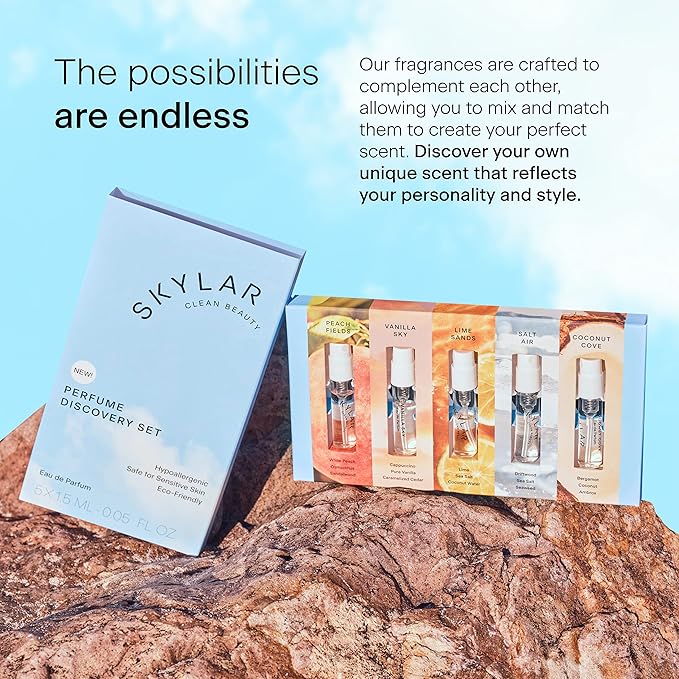 - Special Feature : Nature-Inspired Scents: Discover our five womenĂs fragrances for every mood and every occasion. Whether youĂre feeling breezy, juicy, bright, or warm your dream is just a spritz away., Wear and Pair: Fragrances are designed to either be worn alone or layered together for a scent that is uniquely you., Responsible Fine Fragrance: We go above and beyond the strictest global regulatory standards to ensure your skin's safety. Our ingredient policy was developed with a toxicologist to intentionally omit harmful ingredients., A curated set of five crisp, clean, nature-inspired scents to transport you to your dream destination., Clean Perfume Gift Set: Hypoallergenic, vegan, cruelty free & safe for sensitive skin. Skylar's eau de parfum sample perfumes for women are free from parabens, phthalates, sulfates, synthetic dyes and thousands of harmful chemicals. Nature-Inspired Scents: Discover our five womenĂs fragrances for every mood and every occasion. Whether youĂre feeling breezy, juicy, bright, or warm your dream is just a spritz away., Wear and⌠See more