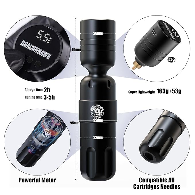 - Comfortable Tattoo Gun: Dragonhawk S8 tattoo pen, 3.5-inch ergonomic design with a comfortable grip; weighs 163g/5.7oz, ideal for precise control and portability; easy to use anytime, anywhere