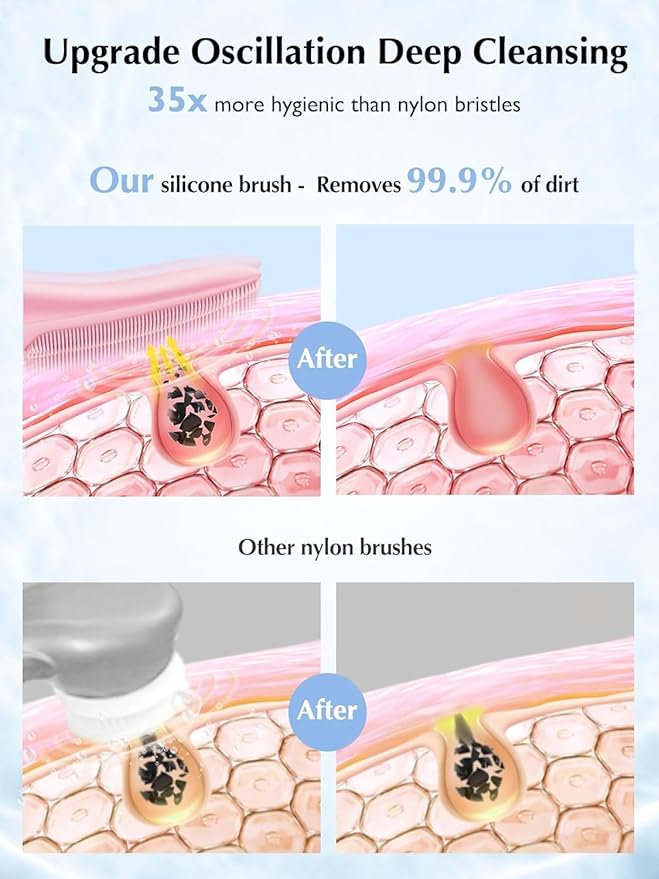 - 4 CLEANSING MODES AND EYE FUNCTION: The portable face cleansing brush device has 4 cleaning modes, easily meeting different cleaning needs, making your skin clearer more vibrant. The innovative triangular constant temperature 40Β° heating zone on the back effectively improves in the eye area, lift the corners of the eyes