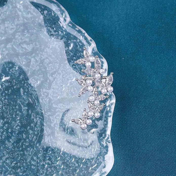 Vintage Crystal Pearl Ear Cuff Earrings Rhinestone Butterfly Cuff Wrap Earrings Cz Butterfly Ear Climber Cuff Earrings Silver Pearl Cz Non Piercing Earring Jewelry for Women(Left)
