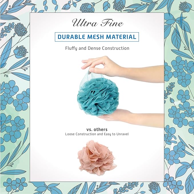 - QUALITY CONSTRUCTION - The loofahs are fluffy and durable with ultra fine mesh material, making them the perfect choice for your daily exfoliating routine. They are gentle on your skin, providing a comfortable and enjoyable experience.