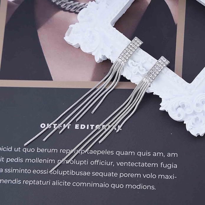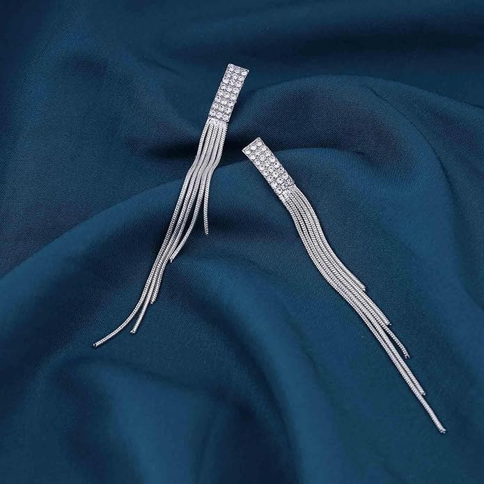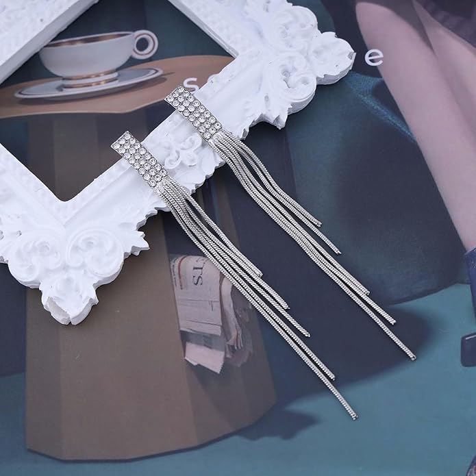 - Long tassel drop earrings.Item Details:Handmade Item.Size:As Shown.Color:Silver.Materials:Quality Alloy/Crystal.Location:Ear.Style:Boho/Vintage.