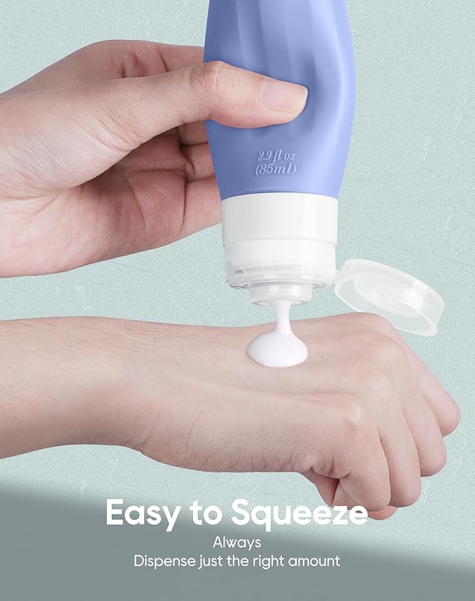 - SAFE SILICONE MATERIAL: Made of Food Grade BPA Free Silicone, this travel set is sturdy, soft, squeezable, flexible and reusable. Safe material guarantee that you can not only use them to store shampoo, conditioner, face soap, sunscreen, creams, lotion or etc, but also safe for food, various seasonings. Soft silicone body make you squeeze out contents easily