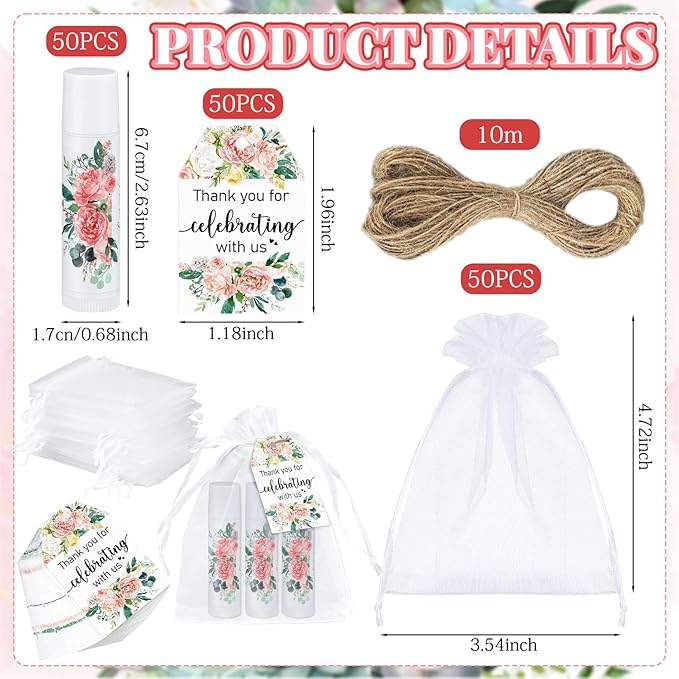 - Spread the Love: our wedding favors set includes 100 honey flavored lip balms (2.64 inches/6.7 cm high), 100 white organza bags (3.54 x 4.72 inches/9 x 12 cm), 100 thank tags (1.57 x 2.36 inches/6 x 4 cm), 1 roll of jute rope (approx.65.62 ft/ 20 m in length) ideal for sharing the love with your guests and loved ones