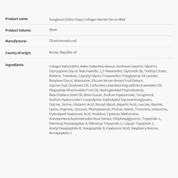 SUNGBOON EDITOR Deep Collagen Barrier Serum Mist | Real Collagen, Multi Peptides, Hydration, Wrinkle Care for Dry Skin, Wrinkles, Korean Moisturizer, Korean Skin Care, Glass Skin Mist