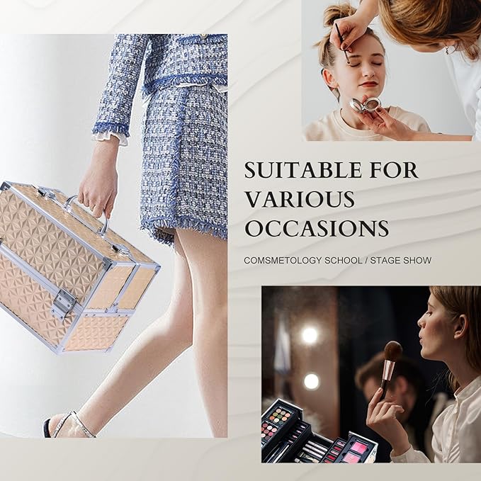 - Recyclable Gold Train Case, Large Capacity: Professional Full makeup kits comes with a large capacity train case and recyclable using. The train case organizers are a great fit for cosmetologist aesthetic supplies, nail techs, personal makeup organizer, traveling makeup box, makeup students, storage tool box and more.
