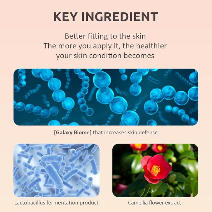 - ✨KEY INGREDIENT: [Galaxy Biome-that increases skin defense],[Lactobacillus fermentation product-boost heart and brain health and offer anti-inflammatory, cancer-fighting, immune-boosting, antidiabetic, and anti-obesity benefits],[Camellia flower extract-easy to grow and work as a fantastic component of natural skin care recipes]