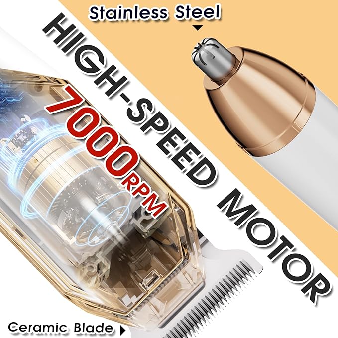 - Women's Hair Removal Kit: This premium hair trimmer set includes a bikini trimmer and four interchangeable heads (for nose hair, eyebrows, body hair, and an electric hair clipper). It comes with a cleaning brush, a velvet bag, a USB charging cable, and three guard attachments for different hair lengths (1-3mm).