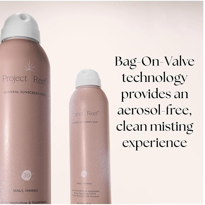 - Sustainable, Non-Aerosol Packaging - Our sunscreen mist is packaged in recyclable aluminum and utilizes non-aerosol BOV (Bag-on-Valve) technology for a sustainable and clean misting experience without harmful propellants. Each purchase from Project Reef removes 1 pound of plastic from the worldβs oceans β the equivalent of 22 water bottles β through partner organizations.