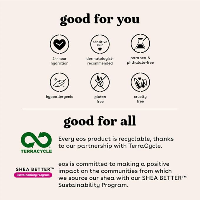 - SUSTAINABLY-SOURCED INGREDIENTS: eos lip balms have wild grown, sustainably sourced, natural shea butter and oil to leave your lips smooth and nourished