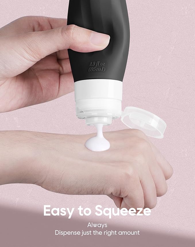 - SAFE SILICONE MATERIAL: Made of Food Grade BPA Free Silicone, this travel set is sturdy, soft, squeezable, flexible and reusable. Safe material guarantee that you can not only use them to store shampoo, conditioner, face soap, sunscreen, creams, lotion or etc, but also safe for food, various seasonings. Soft silicone body make you squeeze out contents easily