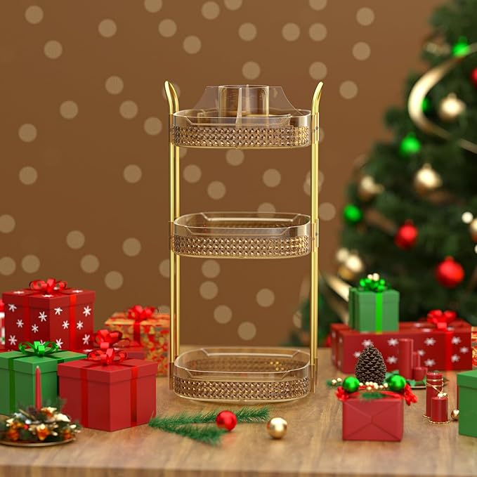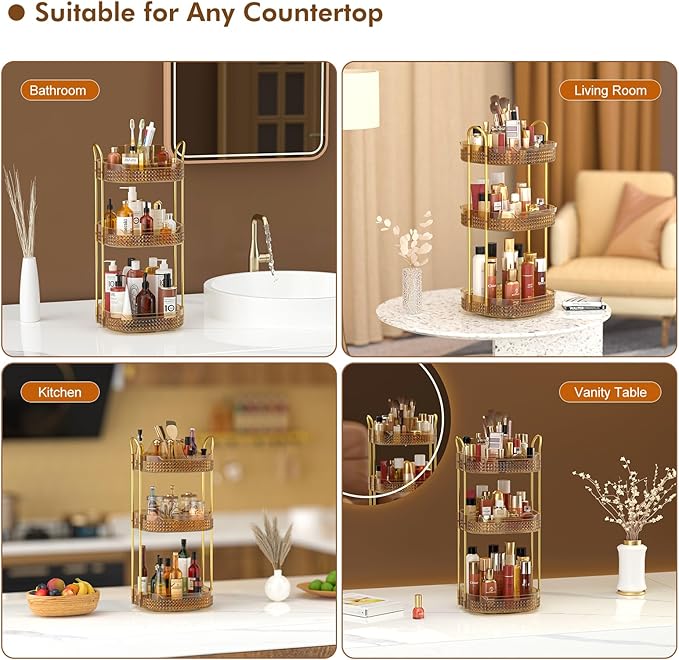 Awenia Rotating Makeup Organizer 360, Stackable Adjustable Large Capacity Cosmetic Storage Unit,Dresser Bathroom Kitchen Countertop Organizer with Metal Handle, Plus Size (Honorable Gold, 3 Tier)