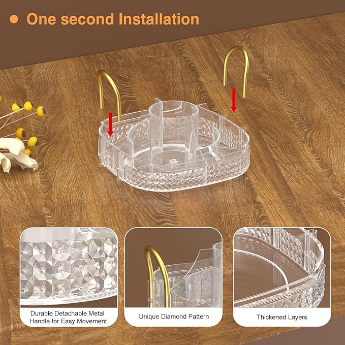 - Multifunction:➤The spinning organizer can be used to store cosmetics, such as:perfume, brushes,nail polish, lipstick,eye shadow,makeup powder, or store bathroom supplies, such as:toothbrush, toothpaste,razor,body lotion.You can use non-compartmented plates as food display plate to store vegetables, fruits, pastries, snacks, etc, or store condiments.