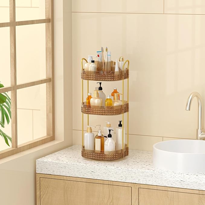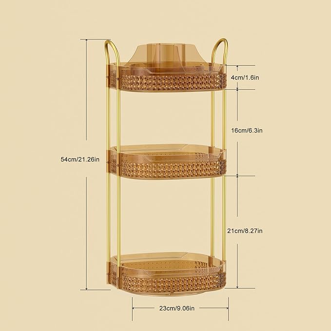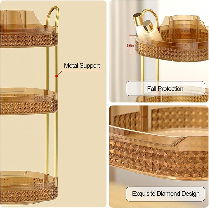 - Premium Quality Materials: The cosmetics organizer is composed of high-quality acrylic trays and sturdy metal brackets, which are stable enough. The edge details of the tray have been raised to prevent items from falling off during rotation