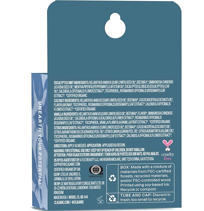 - Cruelty-Free, Made in USA - Cliganic organic lip balms are proudly certified cruelty-free and made in the USA.