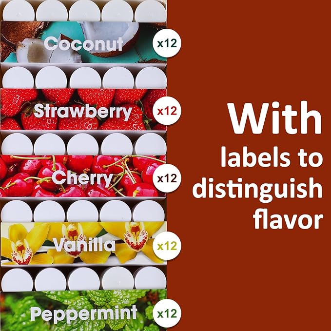 - 【5 Flavors Lip Balm】Cherry, Mint, Strawberry, Coconut, and Vanilla. You get 60 tubes with 12 of each flavor. Ensuring you have an ample supply for all of your needs-Labels are built into the box to help distinguish flavors