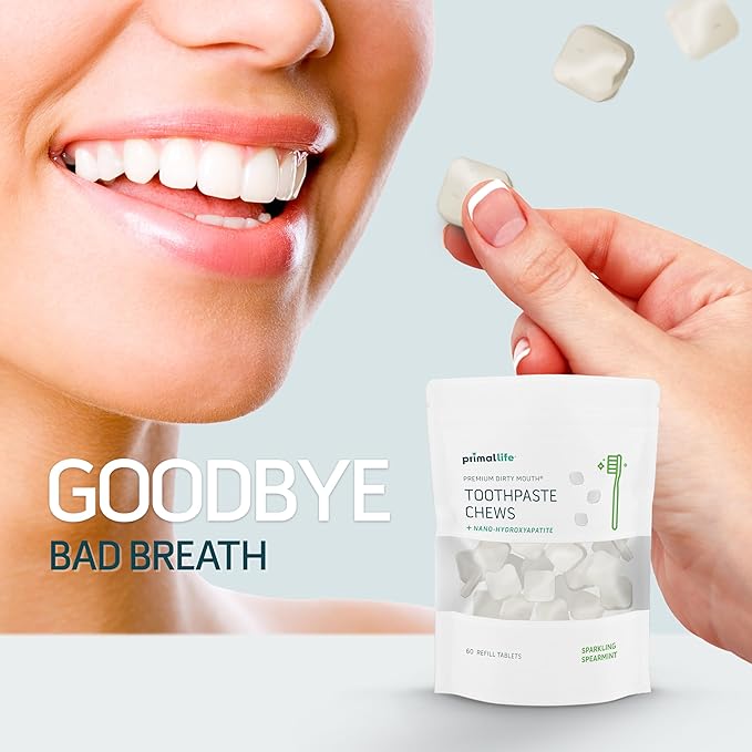 Primal Life Organics Premium Dirty Mouth Toothpaste Chews – Nano-Hydroxyapatite Whitening Toothpaste Tablets for Adults - Gluten Free, Vegan, Paleo - 60 Tablets in Bag - Sparkling Spearmint