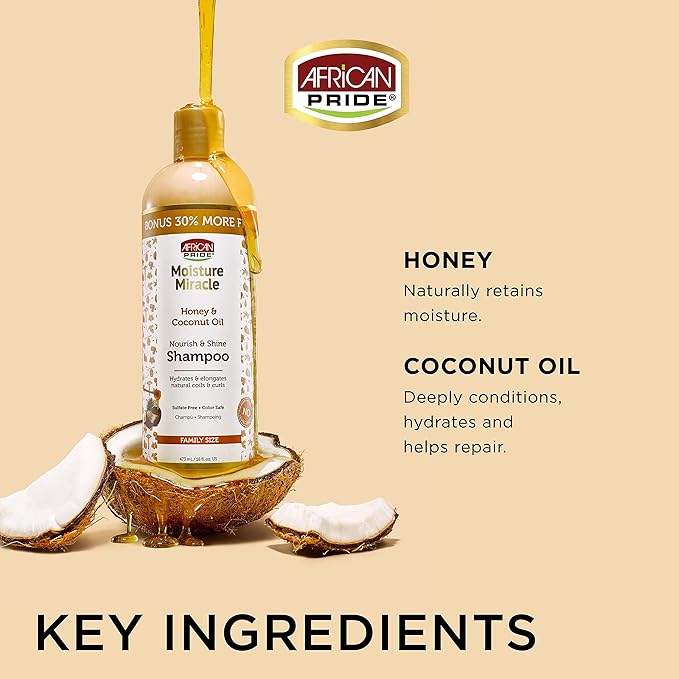 - PROVEN HAIR CARE - African Pride Moisture Miracle Honey & Coconut Oil gently cleanses natural hair to remove dirt & buildup without stripping out natural oils. The blend of Honey & Coconut Oil hydrates & adds shine to natural coils and curls.